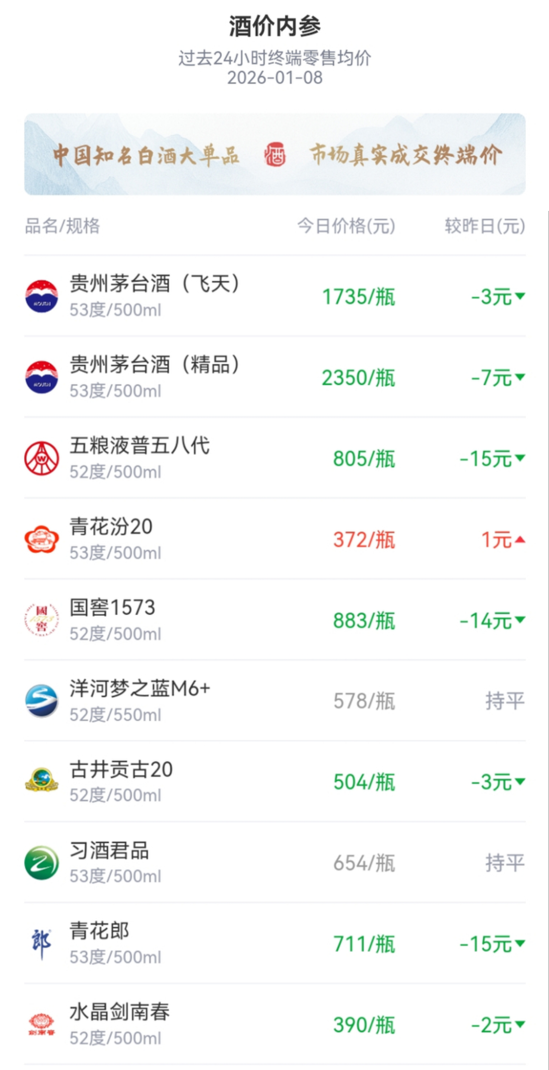 下跌产品中,五粮液普五八代与青花郎价格的回调幅度并列居前,均较前一日下跌15元/瓶;国窖1573价格下跌14元/瓶;精品茅台和飞天茅台价格分别下跌7元/瓶和3元/瓶;古井贡古20下跌3元/瓶;水晶剑南春价格下跌2元/瓶。