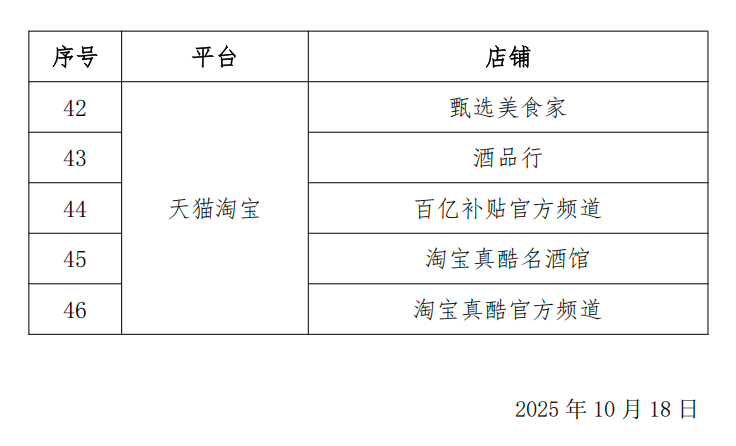 10月19日晚间,五粮液集团官微发布第四封致消费者的告知书,并公布了部分(46家)非授权店铺名单,涉及抖音、京东、快手、美团、拼多多、天猫淘宝等多个平台上的店铺。
