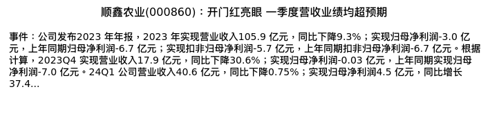 值得注意的是:2024年05月德邦证券的熊鹏分析师,首次发布关于顺鑫农业的研究报告,标题为:顺鑫农业(000860):开门红亮眼 一季度营收业绩均超预期。