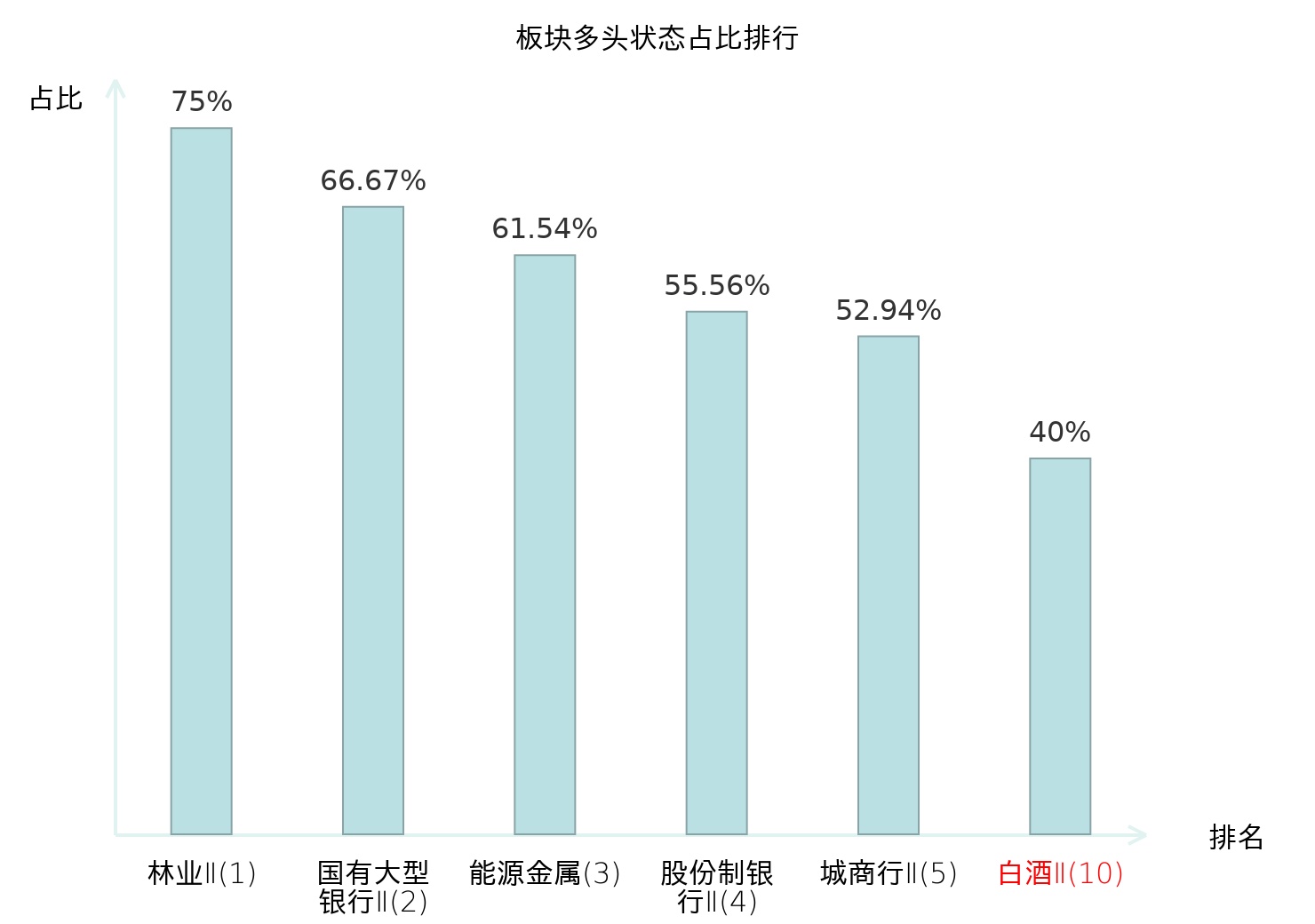 全市场所有行业板块中主力多头状态占比排名中,林业Ⅱ板块位居第一。动物保健Ⅱ板块名次提升最快,较昨日上升82位。
