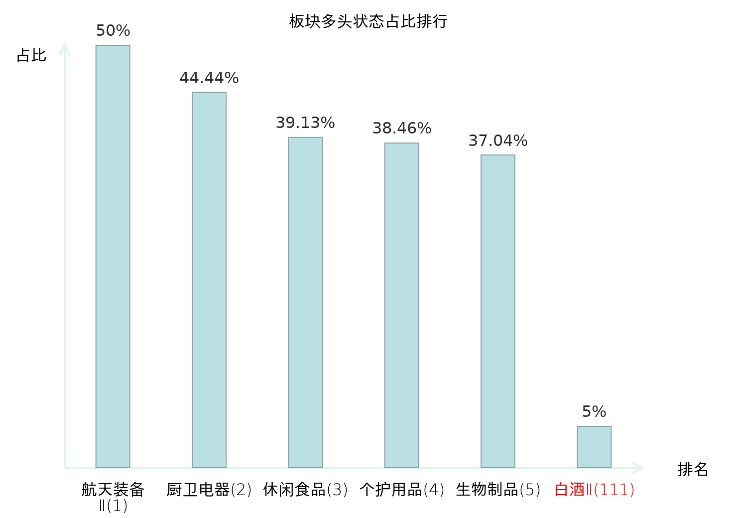 全市场所有行业板块中主力多头状态占比排名中,航天装备Ⅱ板块位居第一。小金属板块名次提升最快,较昨日上升53位。