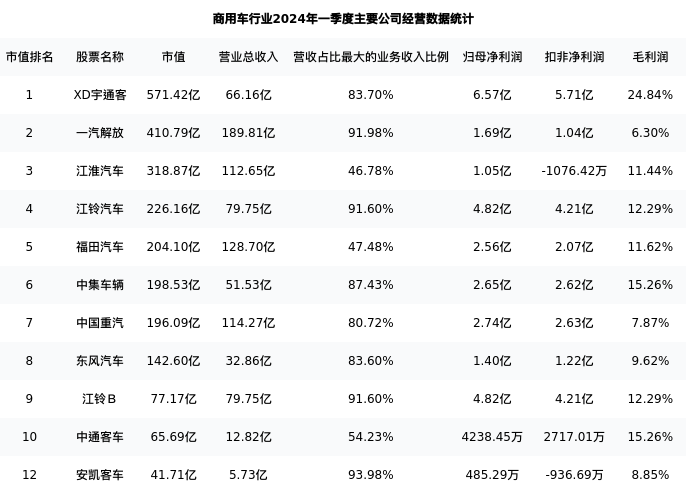 安凯客车最新报告期数据为一季度,下表汇总了商用车行业内市值靠前的公司一季度主要经营数据