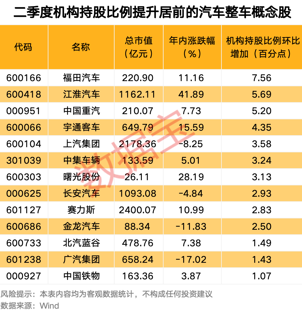 从机构持股比例来看,二季度八成汽车整车概念股获机构加仓,其中13股机构持股比例环比增加均超1个百分点,包含福田汽车、江淮汽车、中国重汽、宇通客车、上汽集团等个股。