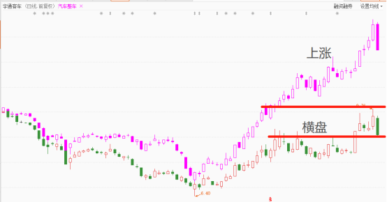 比如上图,宇通客车在指数主升浪的阶段出现了一段横盘整理之后明显滞后于行业板块指数,随后又开启了一波补涨行情。