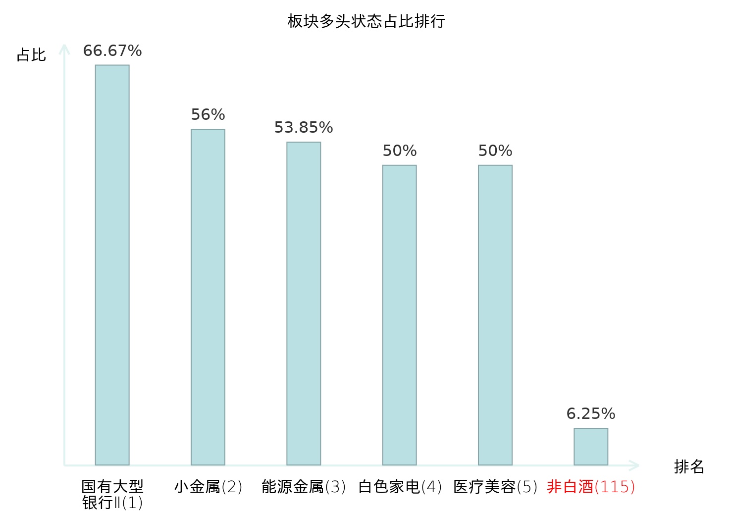 全市场所有行业板块中主力多头状态占比排名中,国有大型银行Ⅱ板块位居第一。酒店餐饮板块名次提升最快,较昨日上升59位。