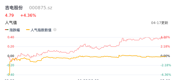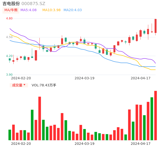 04月17日,吉电股份收报4.79,股价涨幅4.36%,成交金额3.67亿元,换手率2.81%。
