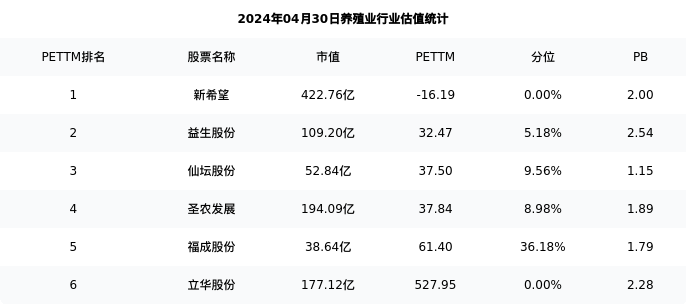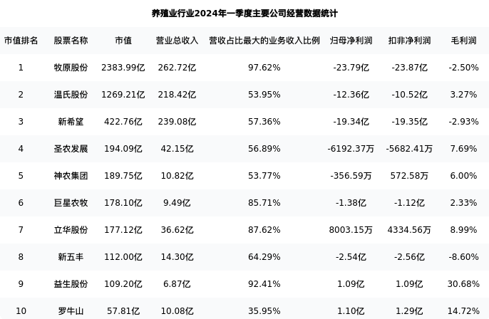新希望最新报告期数据为一季度,下表汇总了养殖业行业内市值靠前的公司一季度主要经营数据