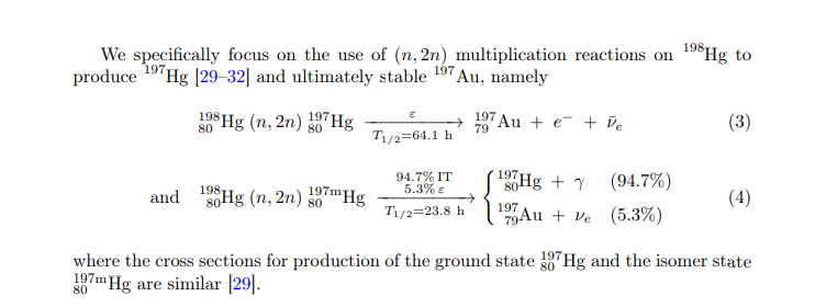 马拉松聚变认为,可以利用这些中子驱动汞-198发生倍增反应,生成汞-197,汞-197会在大约64小时内衰变为金的唯一稳定同位素金-197。