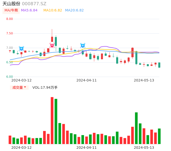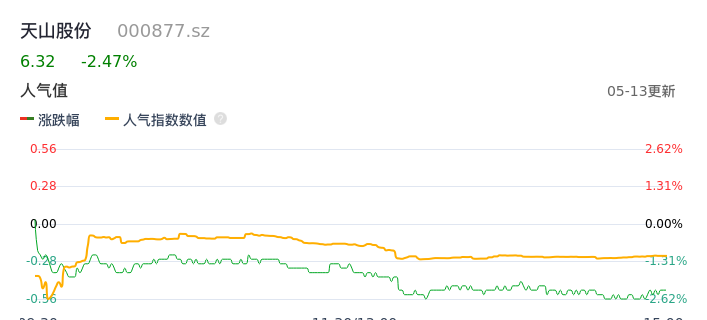 05月13日,天山股份收报6.32,股价涨幅-2.47%,成交金额1.14亿元,换手率0.98%。