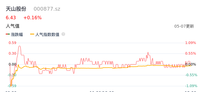 05月07日,天山股份收报6.43,股价涨幅0.16%,成交金额1.17亿元,换手率1.00%。
