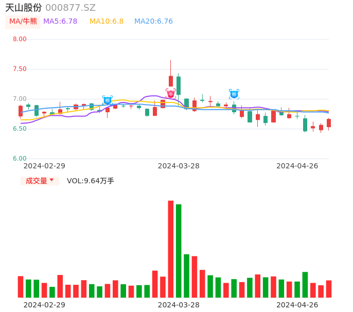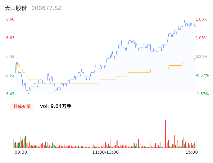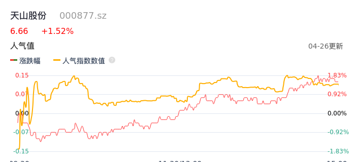 04月26日,天山股份收报6.66,股价涨幅1.52%,成交金额6328.83万元,换手率0.53%。