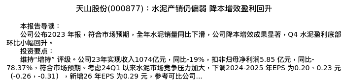 值得注意的是:2024年03月国泰君安的鲍雁辛/杨冬庭/花健祎分析师,首次发布关于天山股份的研究报告,标题为:天山股份(000877):水泥产销仍偏弱 降本增效盈利回升。