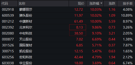 上证报中国证券网讯 8月25日早盘,建材板块走强,截至10时04分,蒙娜丽莎、狮头股份、中旗新材涨停,北京利尔接近涨停,中材科技、天山股份等跟涨。
