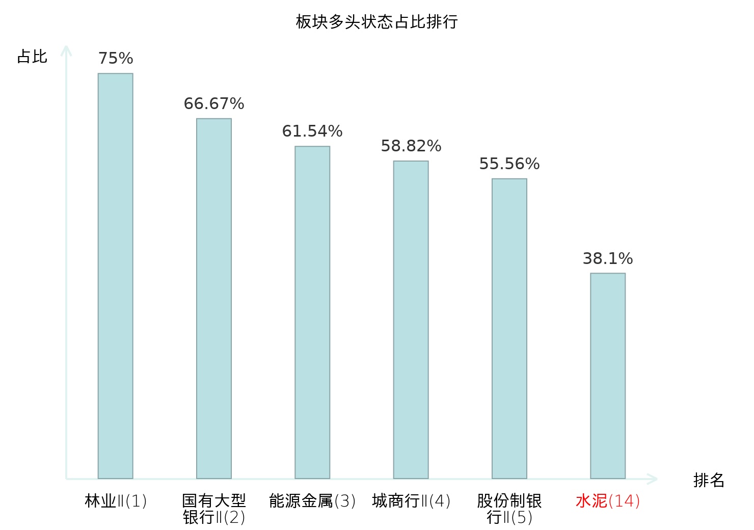 全市场所有行业板块中主力多头状态占比排名中,林业Ⅱ板块位居第一。专业连锁Ⅱ板块名次提升最快,较昨日上升63位。