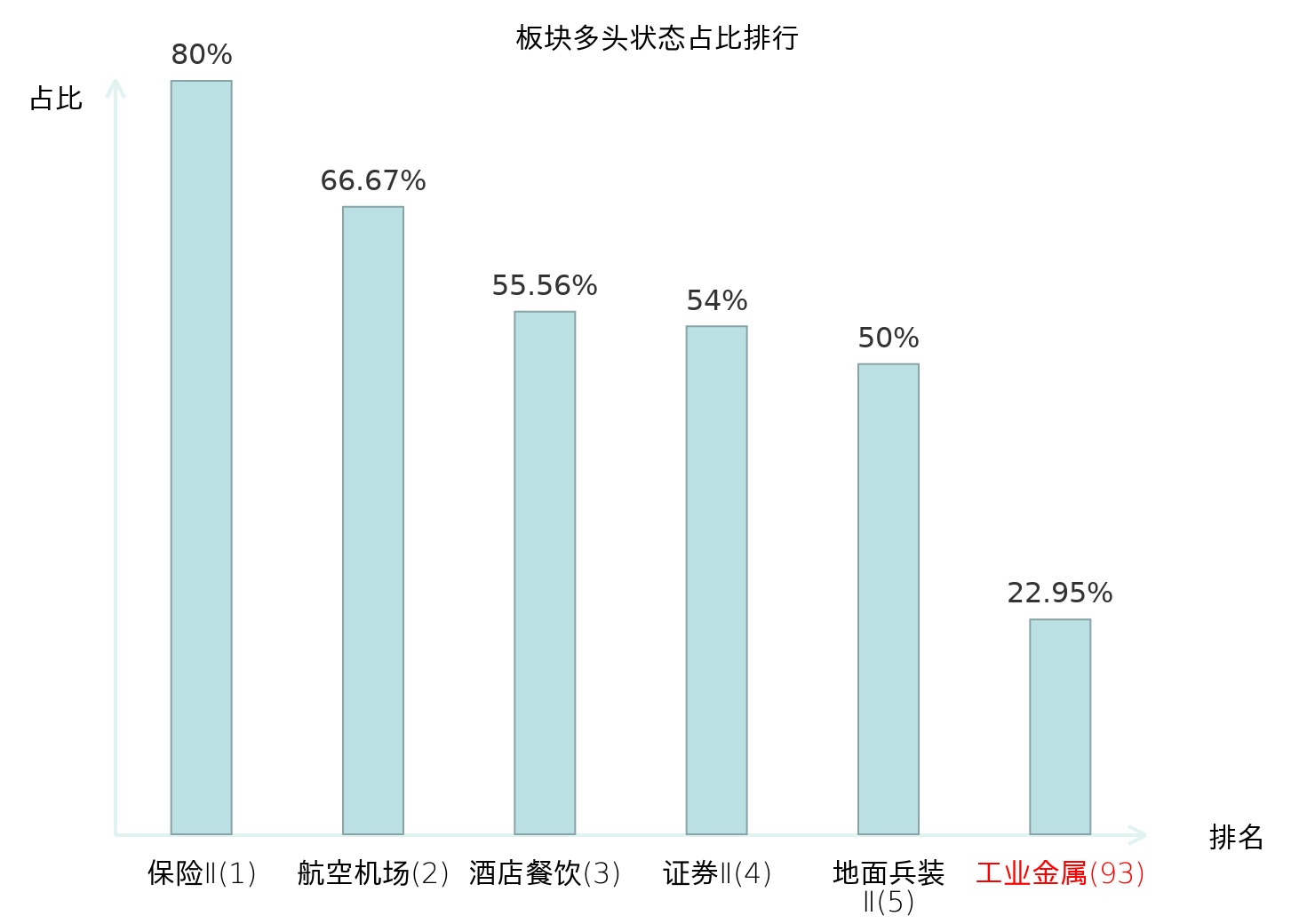 全市场所有行业板块中主力多头状态占比排名中,保险Ⅱ板块位居第一。特钢Ⅱ板块名次提升最快,较昨日上升69位。