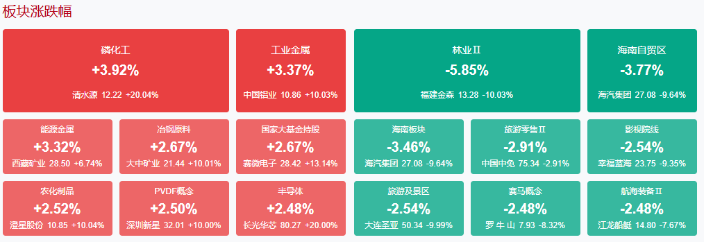 板块方面,磷化工、半导体、CPO等板块涨幅居前,海南、影视院线、旅游及酒店等板块跌幅居前。截至收盘,沪指涨0.97%,深成指涨1.73%,创业板指涨1.84%。