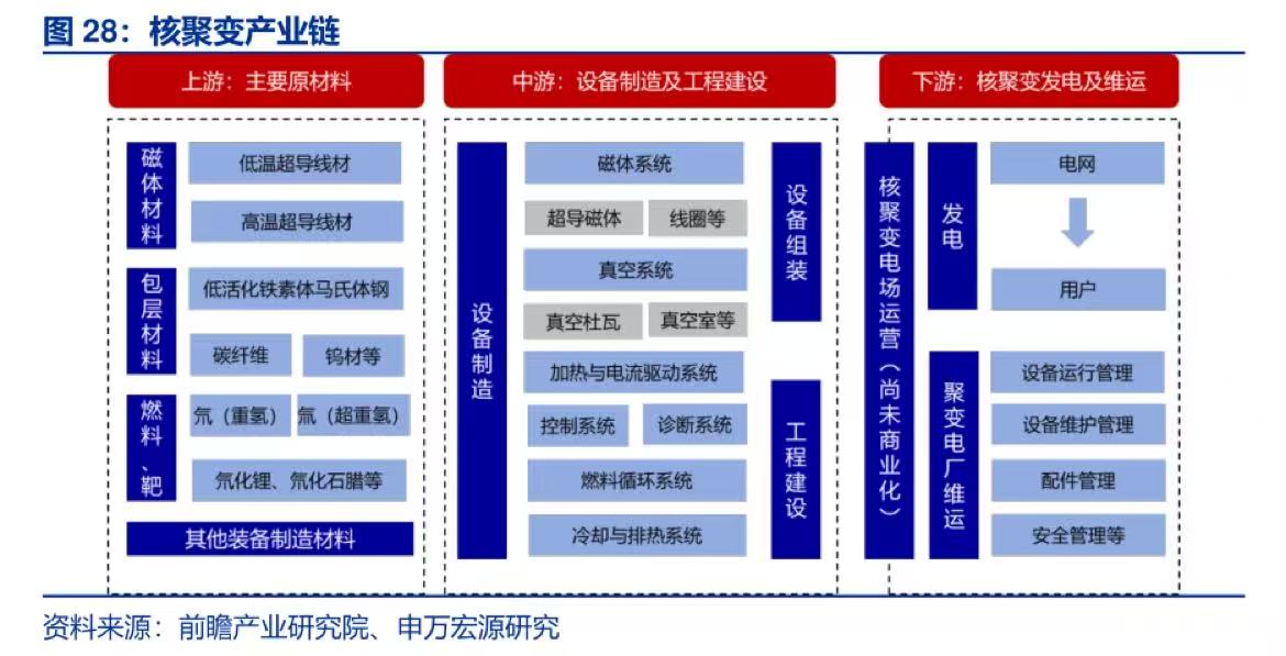 可控核聚变产业链主要分为上游原材料,中游设备,下游应用三大环节,其核心商业模式是发电: