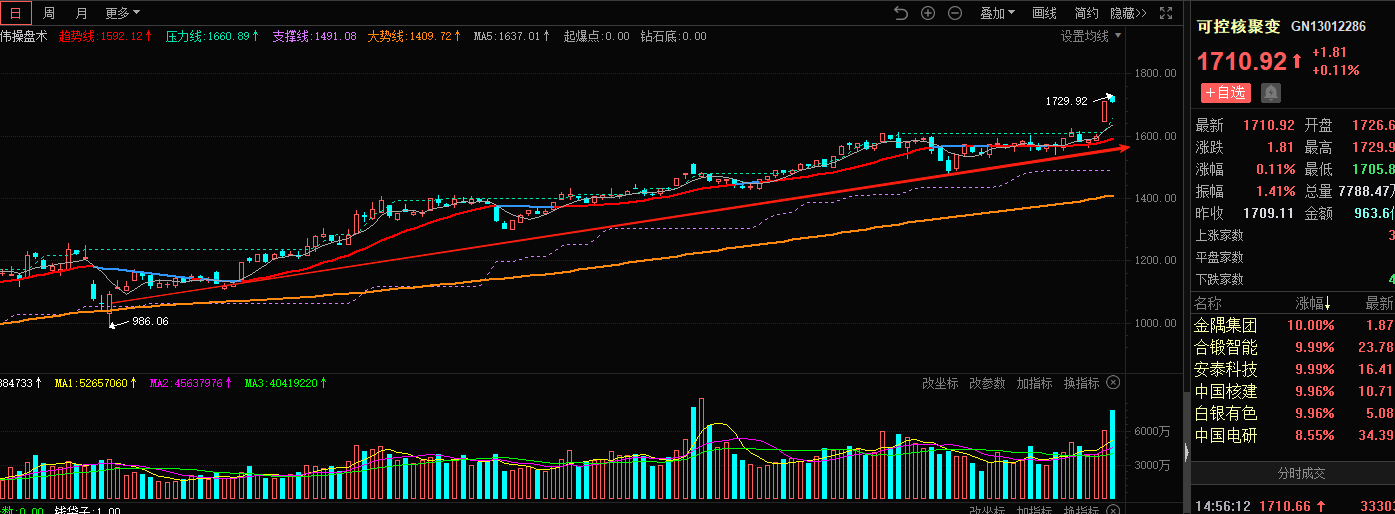 可控核聚变板块指数日K线显示,板块指数目前处于中期趋势上涨中,股价依托经纬操盘指标红色趋势线重心逐步上移,中期上升趋势保持完好,上周放量突破高位箱体上轨平台压制创出新高,有望打开新的上涨空间!