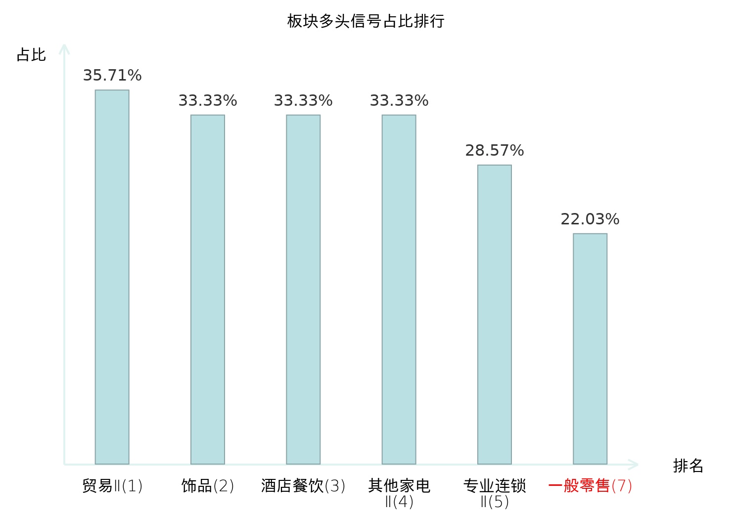 全市场所有行业板块中主力多头信号占比排名中,贸易Ⅱ板块位居第一。其他家电Ⅱ板块名次提升最快,较昨日上升125位。