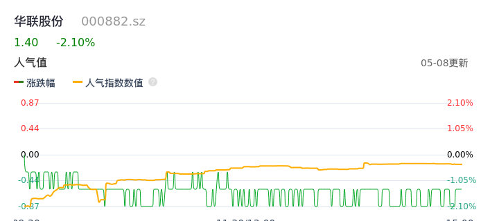 05月08日,华联股份收报1.40,股价涨幅-2.10%,成交金额2440.95万元,换手率0.63%。