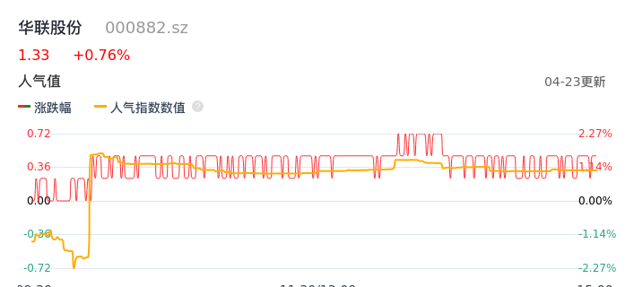 04月23日,华联股份收报1.33,股价涨幅0.76%,成交金额2029.09万元,换手率0.56%。
