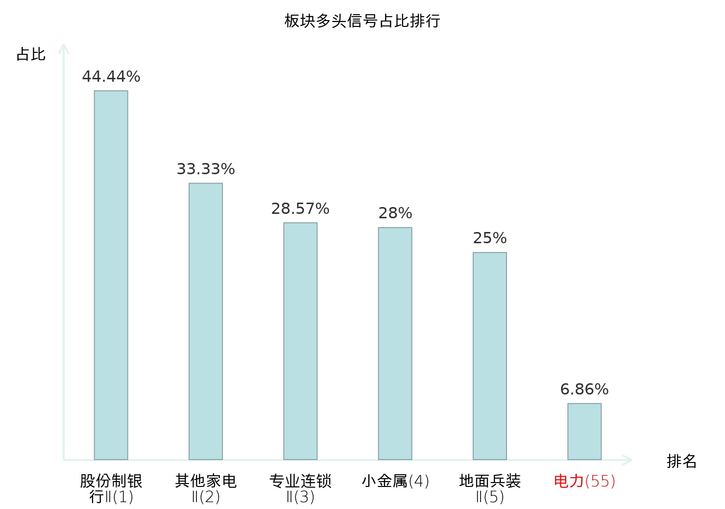全市场所有行业板块中主力多头信号占比排名中,股份制银行Ⅱ板块位居第一。其他家电Ⅱ板块名次提升最快,较昨日上升127位。