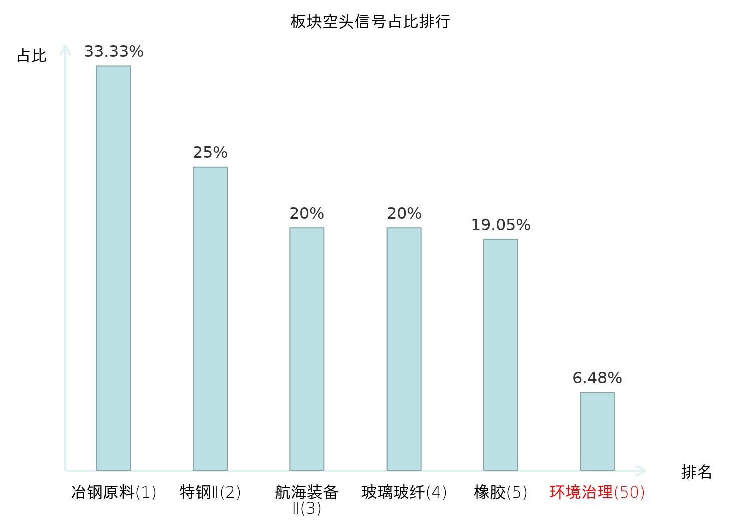 全市场所有行业板块中主力空头信号占比排名中,冶钢原料板块位居第一。军工电子Ⅱ板块名次提升最快,较昨日上升98位。