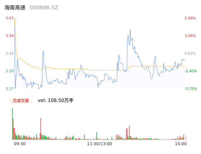05月14日,海南高速收报5.38,股价涨幅0.19%,成交金额5.79亿元,换手率11.10%。