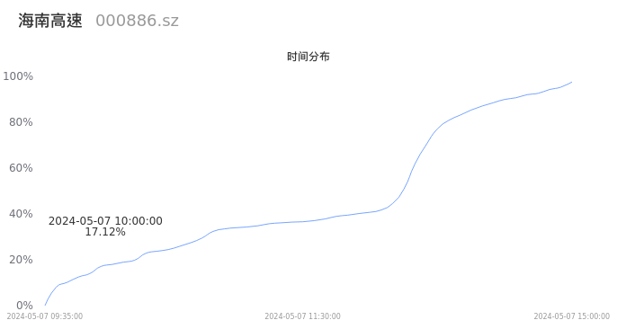 000886海南高速2024年05月07日成交53.50万手,成交金额2.61亿元,相较昨日放量19.04万手,换手率5.47%,成交清淡。