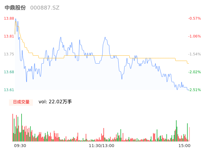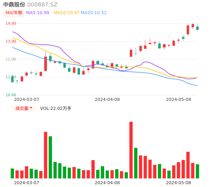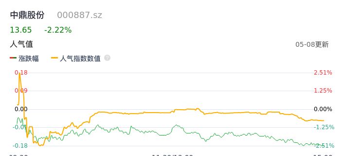 05月08日,中鼎股份收报13.65,股价涨幅-2.22%,成交金额3.02亿元,换手率1.68%。