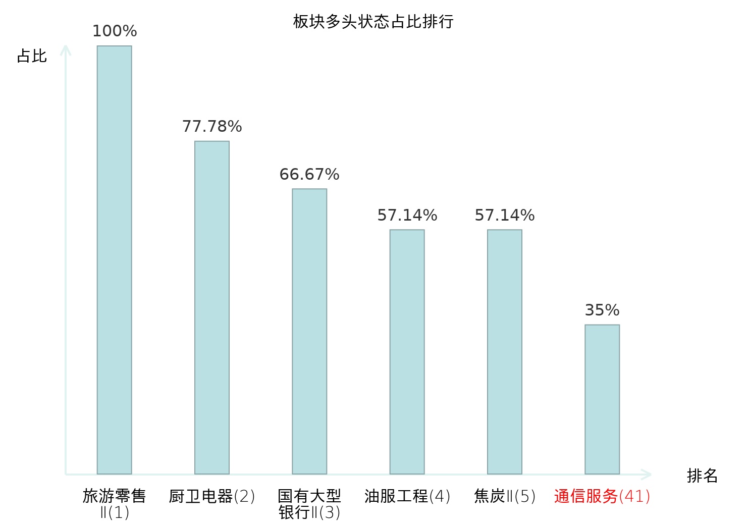 全市场所有行业板块中主力多头状态占比排名中,旅游零售Ⅱ板块位居第一。房地产服务板块名次提升最快,较昨日上升71位。