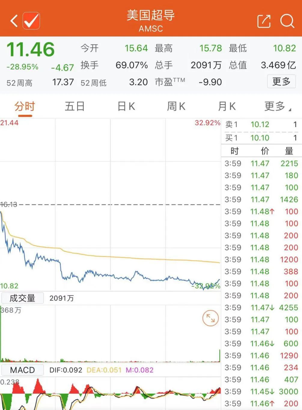美股市场上,股价在盘前一度涨超150%的美国超导,走势同样出现回落。截至8月2日收盘,美国超导股价下跌28.95%,报收于11.46美元。