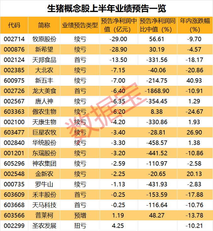 天邦食品、新希望预告上半年归母净利润中值分别为-28.9亿元和-13.5亿元。禾丰股份、天马科技、龙大美食、天邦食品上半年业绩由盈转亏。