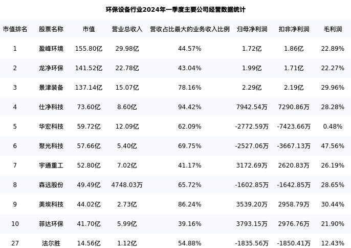法尔胜最新报告期数据为一季度,下表汇总了环保设备行业内市值靠前的公司一季度主要经营数据