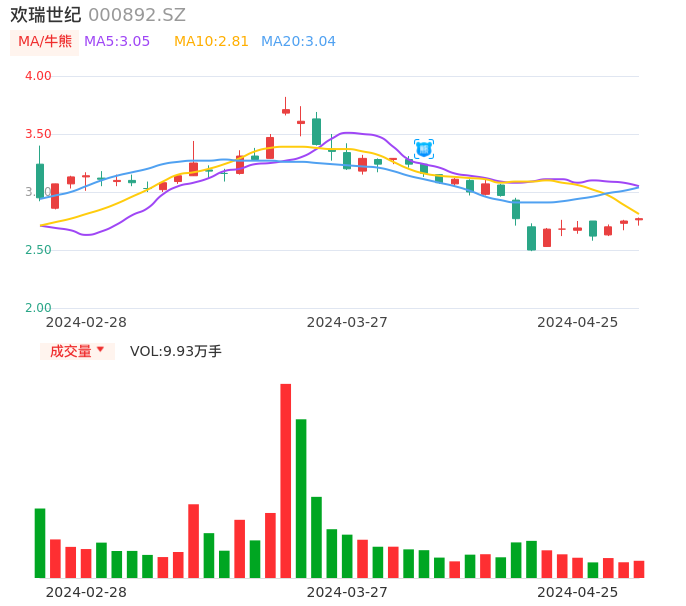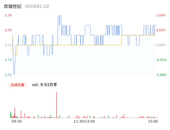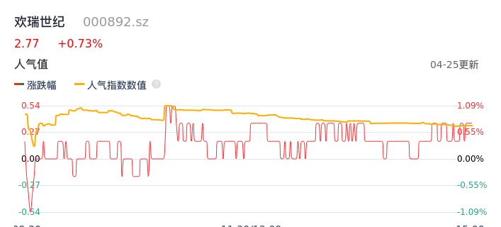 04月25日,欢瑞世纪收报2.77,股价涨幅0.73%,成交金额2735.35万元,换手率1.40%。