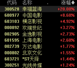 7月28日,影视院线板块表现活跃,截至发稿,幸福蓝海20%涨停,中国电影涨超8%,横店影视、欢瑞世纪等跟涨。