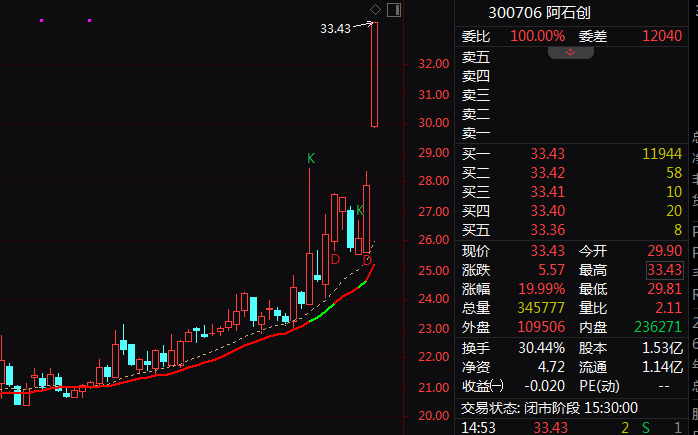 午后,芯片股持续拉升,阿石创20cm涨停,芯导科技涨超13%,寒武纪涨超12%,赛微微电、翱捷科技涨超11%,恒玄科技、气派科技、立昂微、台基股份、华虹公司等跟涨。