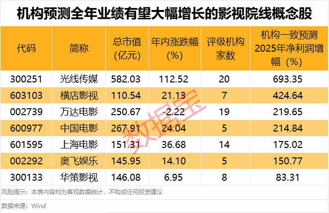 从业绩预期来看,7只概念股获得至少5家机构给予评级,且机构一致预测这些个股2025年全年业绩有望大幅度增长,其中光线传媒、横店影视、万达电影的预增幅度分别高达693.35%、424.64%、219.65%。