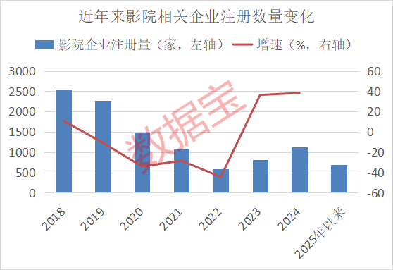 随着国内电影市场逐步复苏,影院公司注册量在经历多年的下滑后,2024年和2025年注册数量走高。企查查数据显示,国内现存影院相关企业1.52万家。2024年全年注册1122家相关企业,同比增长38.35%。截至目前,今年已注册686家,其中上半年注册583家,同比增长15.22%。
