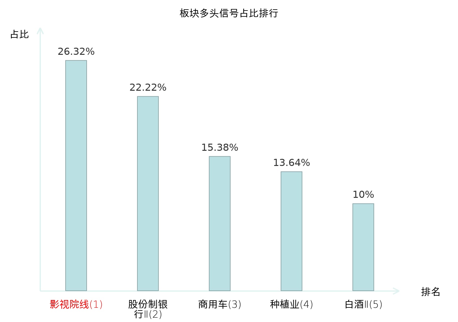 全市场所有行业板块中主力多头信号占比排名中,影视院线板块位居第一。股份制银行Ⅱ板块名次提升最快,较昨日上升115位。