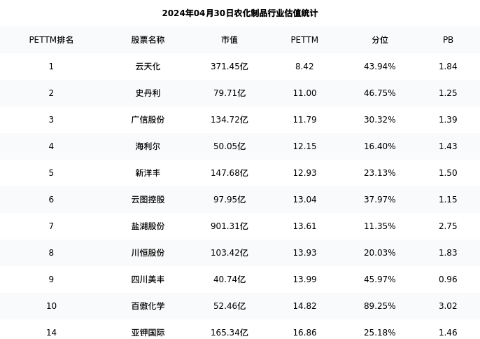 从估值角度看:亚钾国际最新市盈率PETTM为16.86,在行业内排名14/57,处于25.18分位。