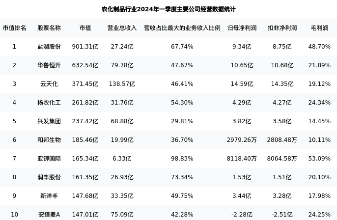 亚钾国际最新报告期数据为一季度,下表汇总了农化制品行业内市值靠前的公司一季度主要经营数据