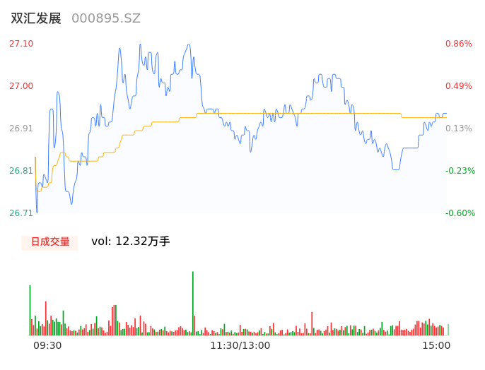 04月15日,双汇发展收报26.93,股价涨幅0.22%,成交金额3.32亿元,换手率0.36%。