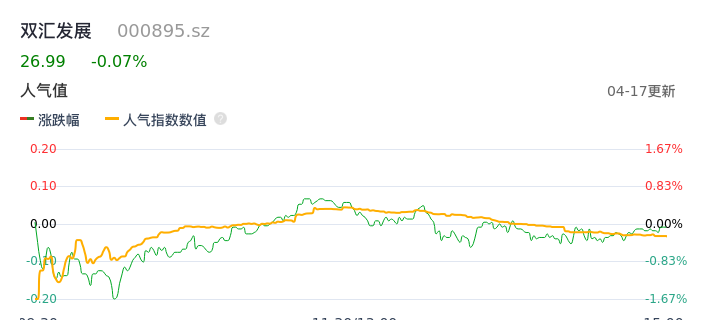 04月17日,双汇发展收报26.99,股价涨幅-0.07%,成交金额3.70亿元,换手率0.40%。