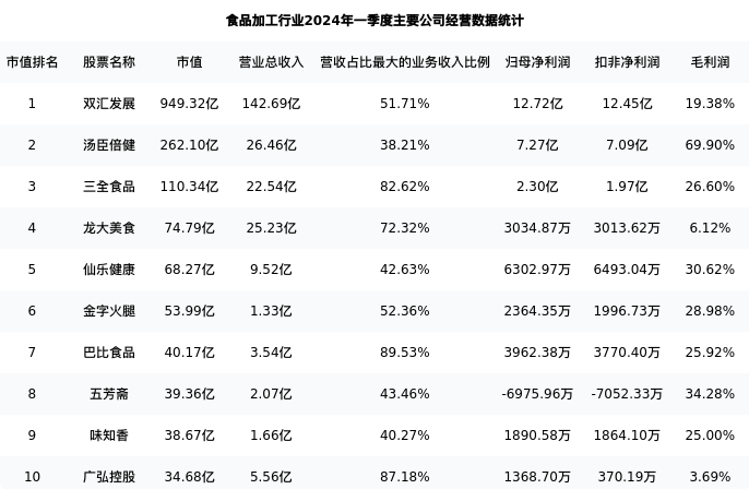 双汇发展最新报告期数据为一季度,下表汇总了食品加工行业内市值靠前的公司一季度主要经营数据