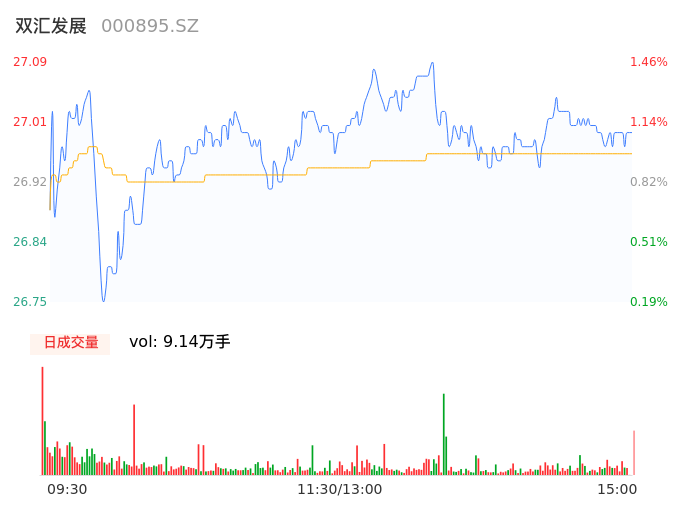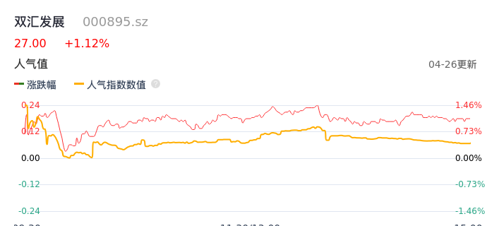 04月26日,双汇发展收报27.00,股价涨幅1.12%,成交金额2.46亿元,换手率0.26%。