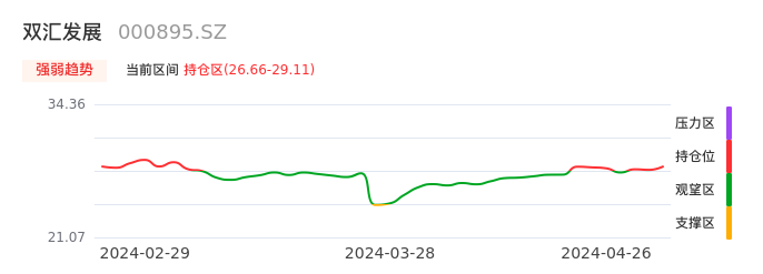 我们来看一下该股的九方特色指标强弱趋势的情况:双汇发展近日从观望区上穿到持仓区。股价短期站上多头区域,但还未完全站稳。后续重点关注多空分界点的争夺:26.66元。如未能有效站稳则可能重新回到空头行情。