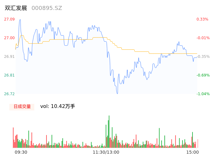 04月29日,双汇发展收报26.90,股价涨幅-0.37%,成交金额2.81亿元,换手率0.30%。