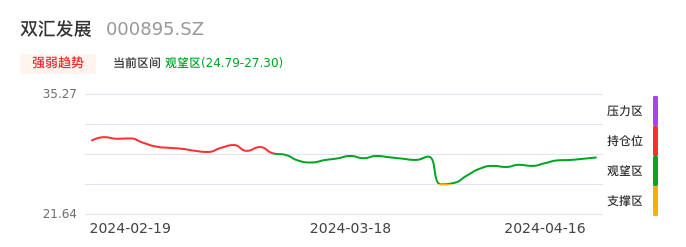 我们来看一下该股的九方特色指标强弱趋势的情况:双汇发展自03月28日从支撑区回到观望区。股价前期快速下跌后经过中途弱势整理。目前短期处于弱势反弹迹象,后续重点关注能否站上多空分界点:27.30元。如未能有效突破则说明弱势反弹行情结束。后续可能再次进入空头行情。