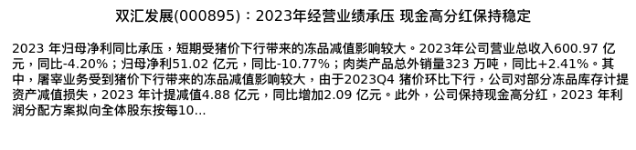 值得注意的是:2024年04月国信证券的鲁家瑞/李瑞楠分析师,首次发布关于双汇发展的研究报告,标题为:双汇发展(000895):2023年经营业绩承压 现金高分红保持稳定。